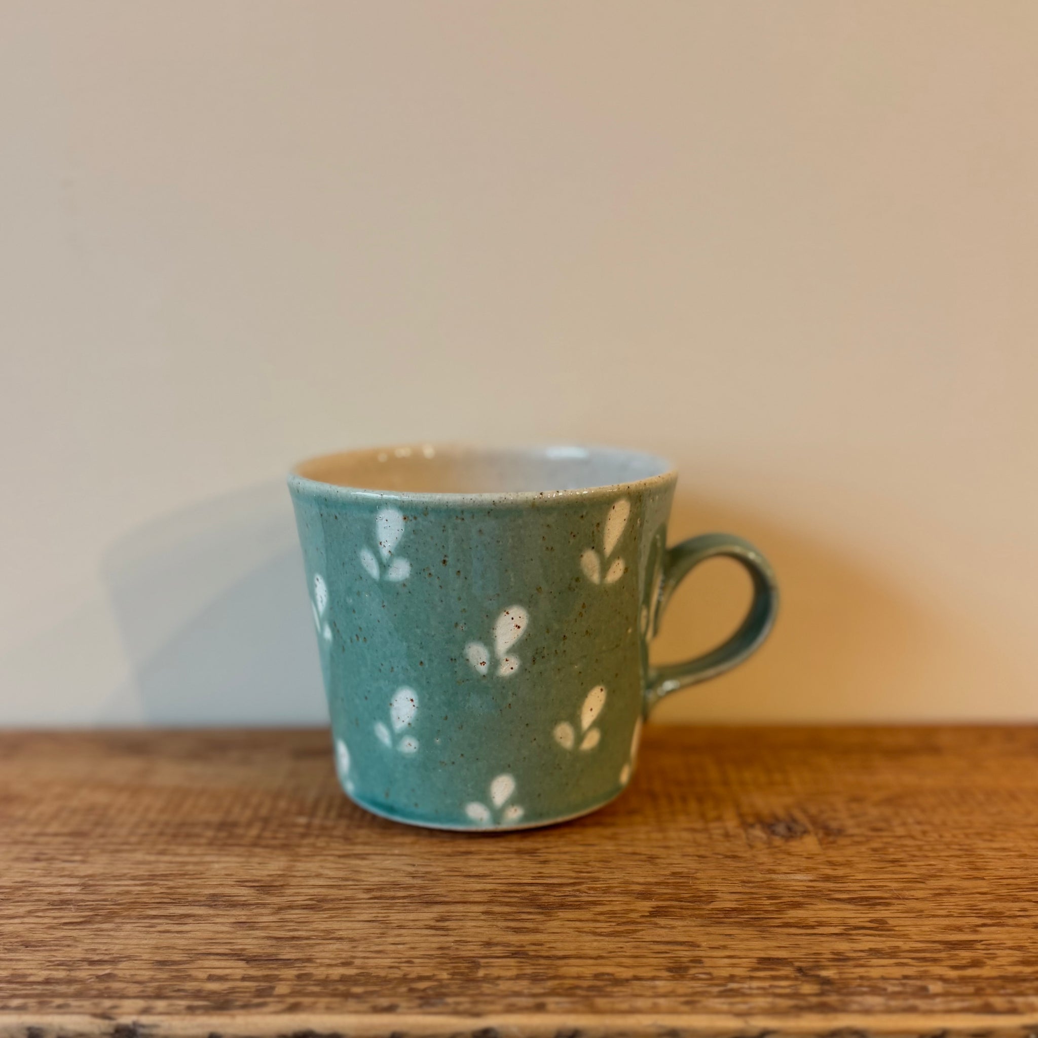 Hand thrown large stoneware mug with a slight speckle. Blue green glaze with white leaf decoration . Contrasting clear glaze to the interior.